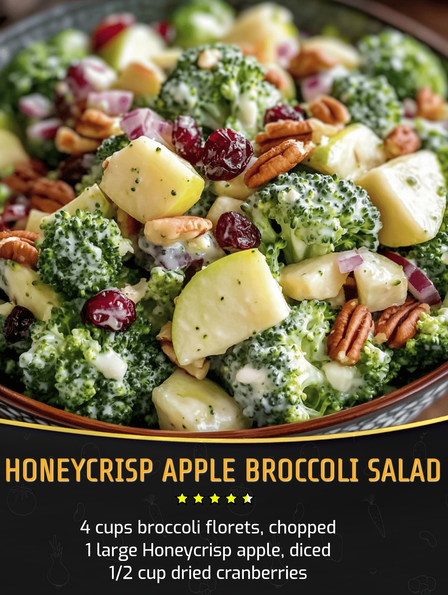 Chop the broccoli into bite-sized florets approximately half-inch in size to ensure each piece gets properly coated with dressing. Core and dice the Honeycrisp apple into quarter-inch cubes, leaving the skin on for color and nutrients. Combine these main components in your largest mixing bowl with the cranberries, nuts, onion, and cheese, ensuring ample space for thorough tossing.