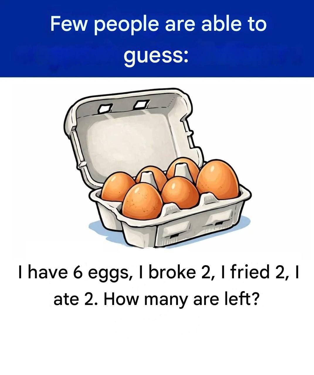“I have six eggs. I broke two. I fried two. I ate two. How many do I have left?”